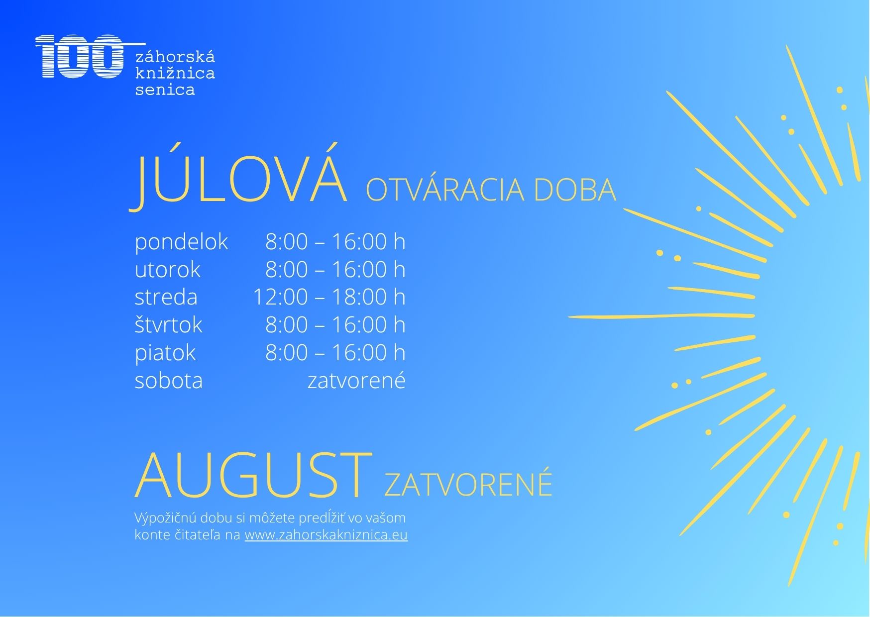 V júli 2025 budeme mať otvorené v letnom režime. Upozorňujeme, že počas celého augusta bude knižnica ZATVORENÁ (všetky oddelenia). Výpožičky si môže každý čitateľ predĺžiť prostredníctvom svojho čitateľského konta v online katalógu na https://www.zahorskakniznica.eu/katalogy.