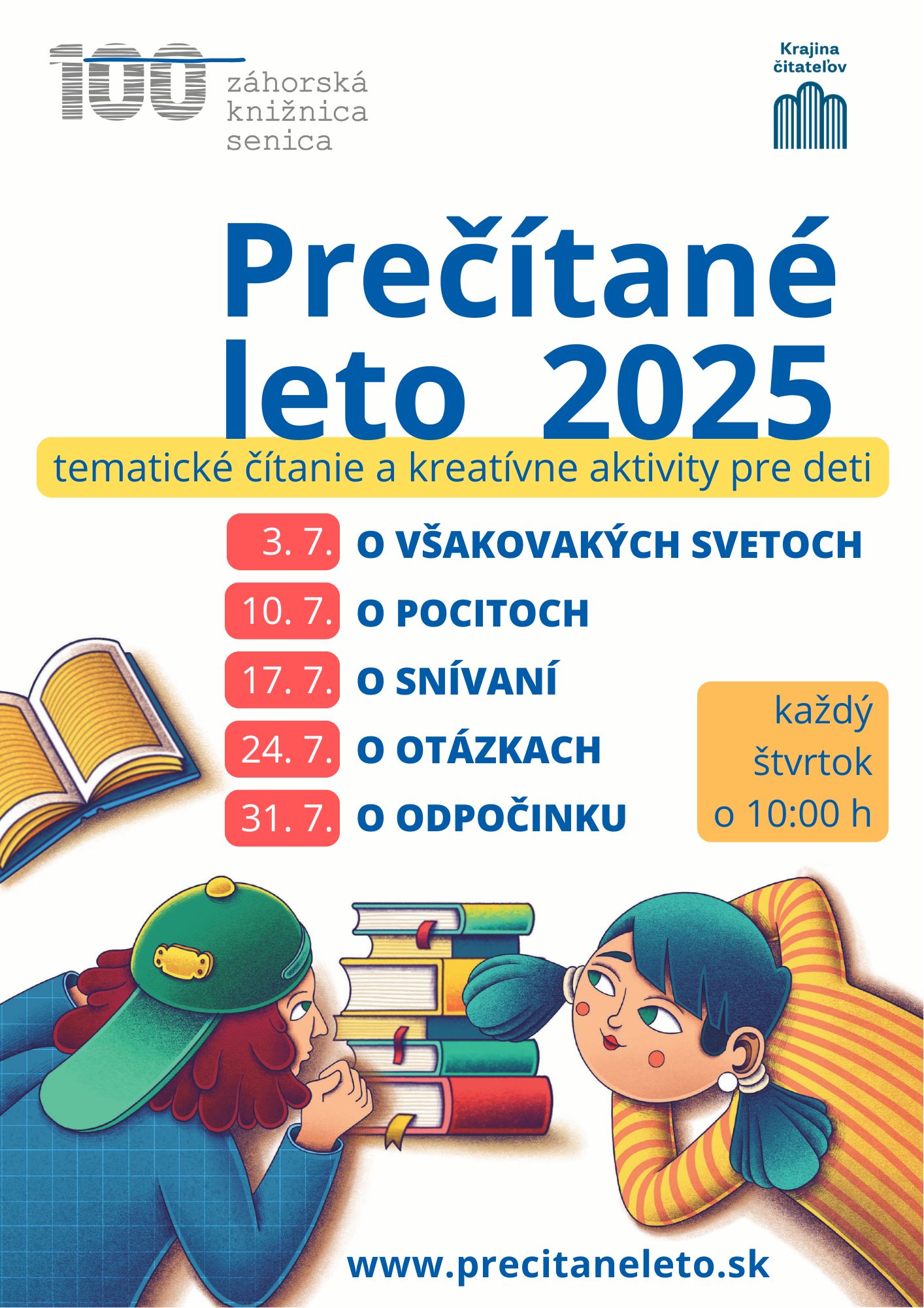Aj v tomto roku sa zapájame do celoslovenskej aktivity Prečítané leto. Každý júlový štvrtok o 10 h pozývame deti na aktivity plné príbehov a tvorivosti.