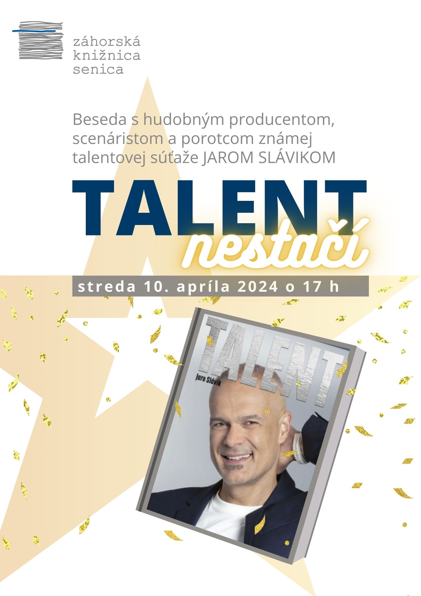 V stredu 10. apríla 2024 sa o 17 h uskutoční stretnutie s hudobným producentom, scenáristom a porotcom talentovej súťaže Jarom Slávikom.